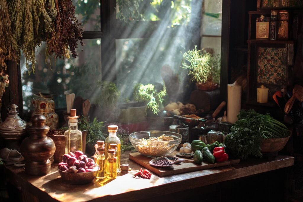 直感で野菜を選び、自然界の声を感じ取ります。 - スパイスと調味料の魔法